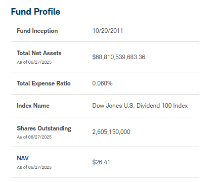 - 기초지수: Dow Jones U.S. Dividend 100 Index