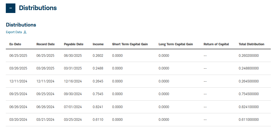 - 최근 분기당 배당금은 약 $0.24~0.26 수준에서 형성되며, 3월 배당금은 $0.2488, 6월 배당금은 $0.2602입니다.