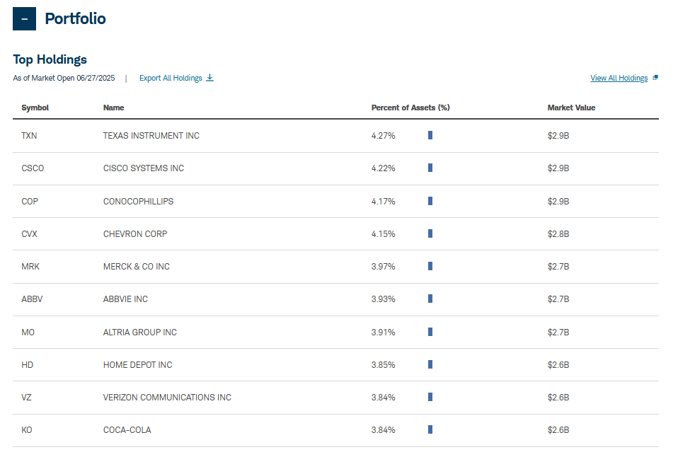✔️ 에너지(CVX, COP), 헬스케어(MRK, ABBV), 소비재(KO, MO, HD), IT(TXN, CSCO), 통신(VZ) 등 다양한 업종이 포함되어 있습니다.